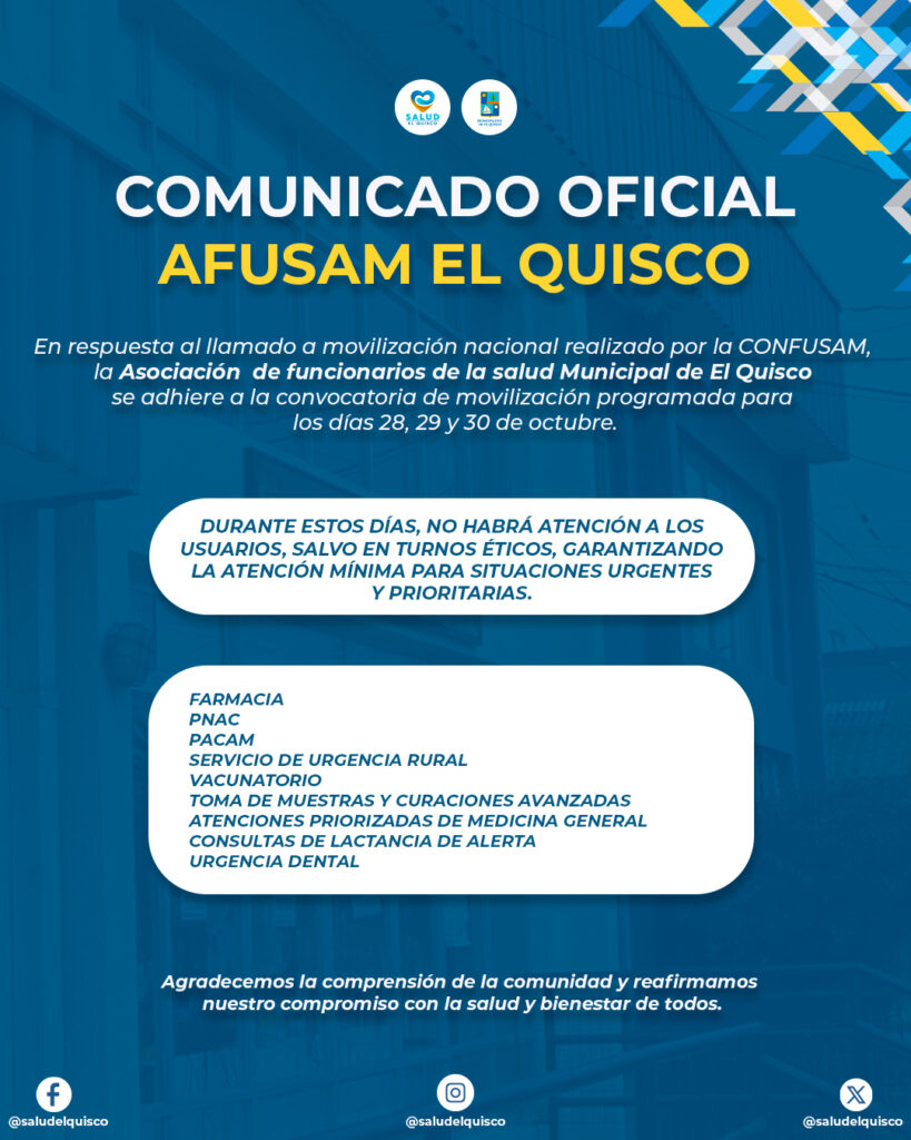Para los días 28, 29 Y 30 de octubre la COMFUSAM realizó un llamado a Movilización Nacional a la que los funcionarios y funcionarias de El Quisco se adhieren por lo que, esos días, no se registrarán atenciones normales en nuestros centros de salud comunales (CESFAM, CECOSF, etc.). La movilización responde a la grave situación […]